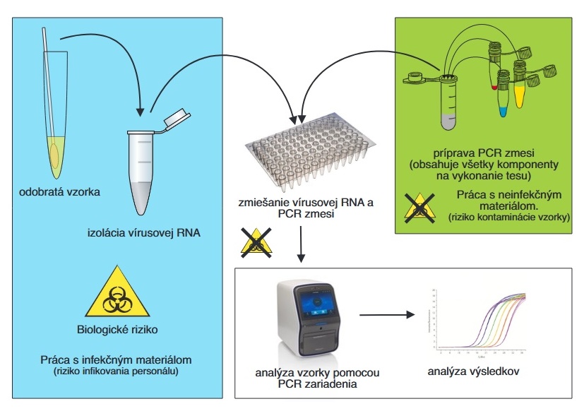 Detekcia koronavírusu SARS-CoV-2 nemôže byť realizovaná v bežnom molekulárnom laboratóriu. Keďže ide o prácu s potenciálne infekčným materiálom, je nevyhnutné zabezpečiť ochranu pracovníkov realizujúcich testovanie. Na druhej strane je potrebné zabrániť tomu, aby sa do PCR reakcie dostali molekuly vírusovej RNA vzdušnou kontamináciou, pretože by znehodnotili testovanú vzorku.