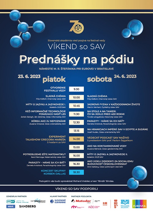 SAV sa pri príležitosti 70. výročia predstaví širokej verejnosti na podujatí Víkend so SAV. V piatok 23. a v sobotu 24. júna 2023 sa v Bratislave na námestí M. R. Štefánika budú prezentovať pracoviská SAV z celého Slovenska. Návštevníci majú jedinečnú šancu interaktívnym spôsobom nahliadnuť do sveta vedy a spoznať výskumné témy a výsledky vedeckých tímov SAV. Deti aj dospelých čaká viac ako 50 stánkov s rozmanitými expozíciami, aktivitami a súťažami. Prednáškami nabitý piatkový program na pódiu doplní natáčanie relácie Experiment s Gregorom Marešom a podvečerný koncert kapely Korben Dallas.