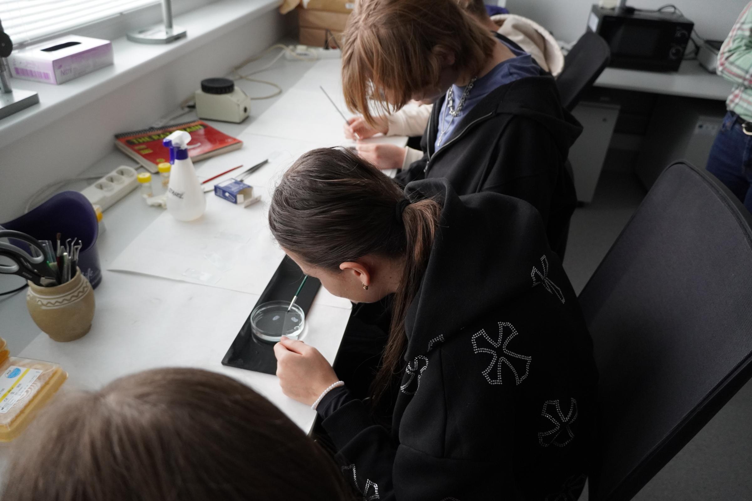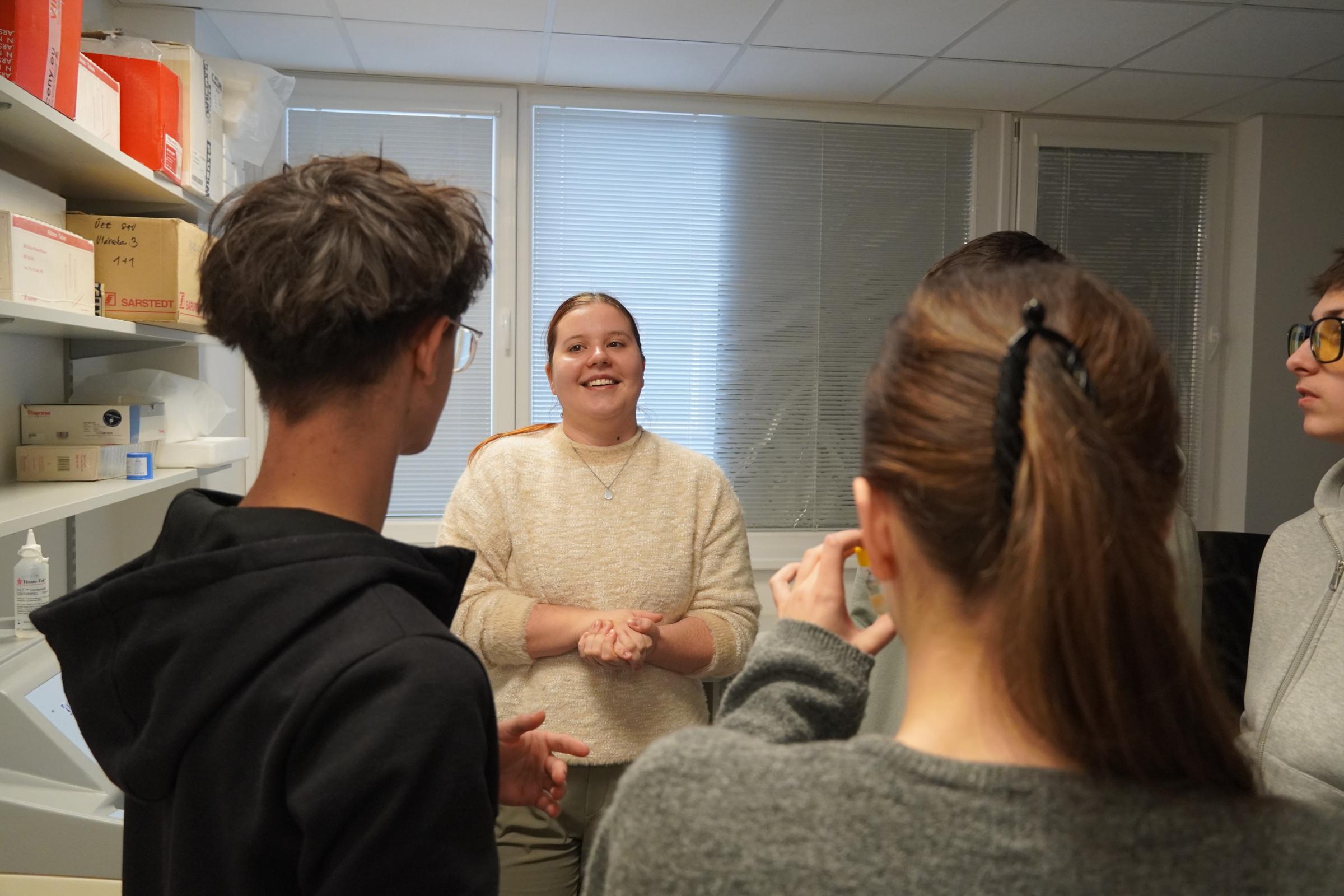 V Neurovednej výskumnej skupine si mali možnosť vyskúšať si jednotlivé kroky spracovania tkaniva mozgu. „Najprv rezali zamrazené tkanivo na veľmi tenké rezy, ktoré opatrne preniesli na podložné sklíčka. Pripravené a ofarbené rezy potom pozorovali pod mikroskopom, kde rozoznávali jednotlivé časti mozgu,“ opisuje Dr. Denisa Mihalj z Neurovednej výskumnej skupiny.